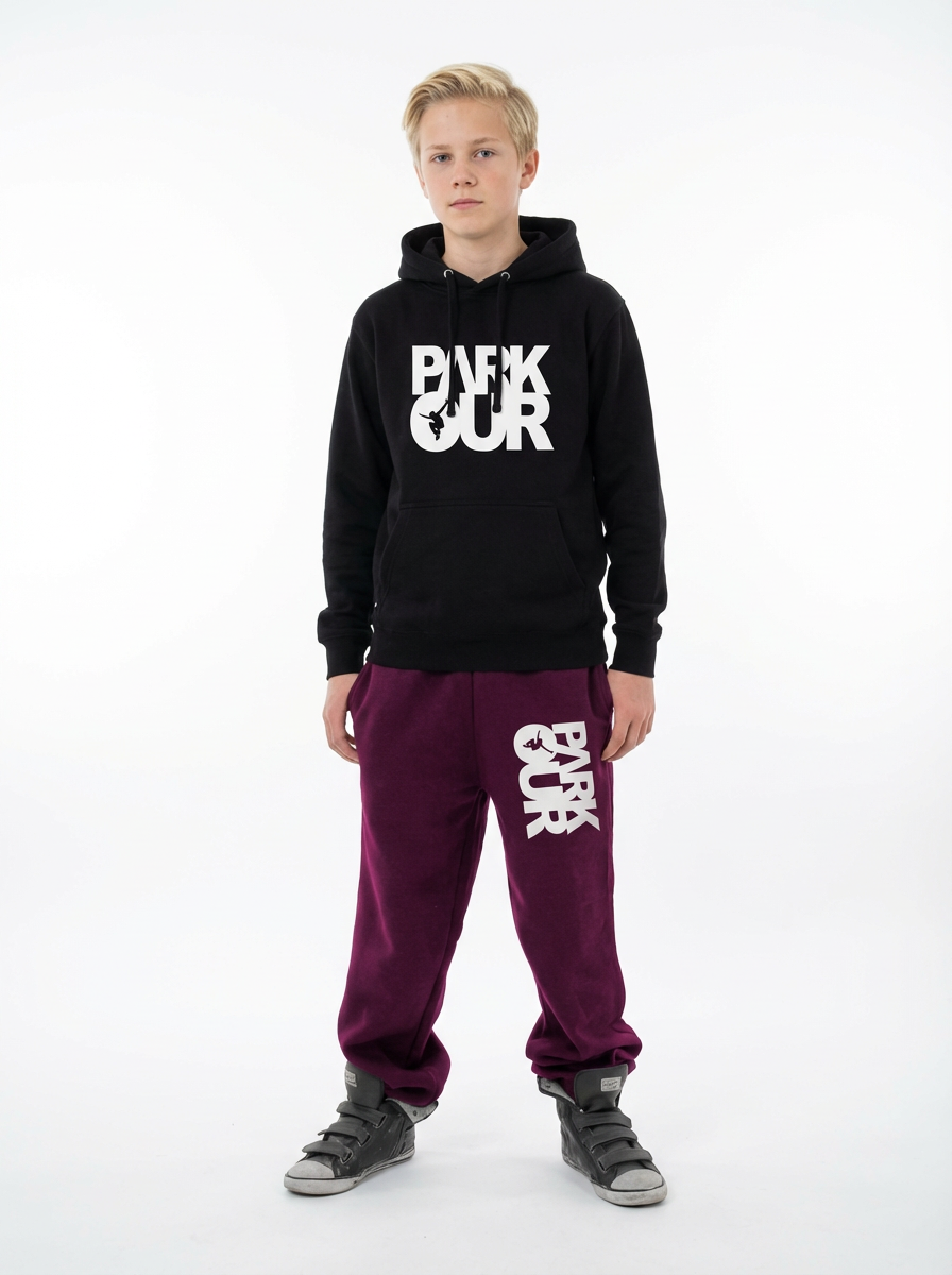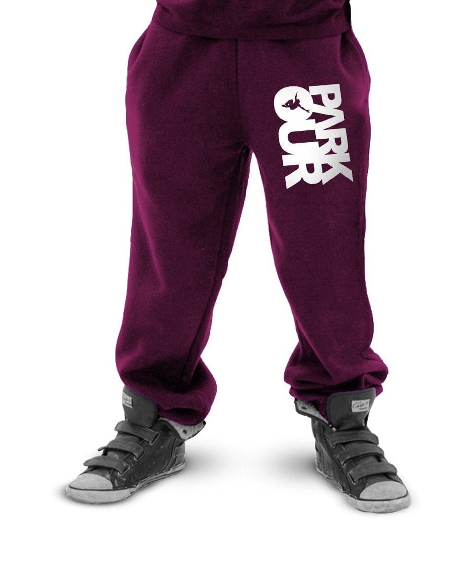 Fede træningsbukser i loose fit med "PARKOUR"-logo ned langs venstre ben.